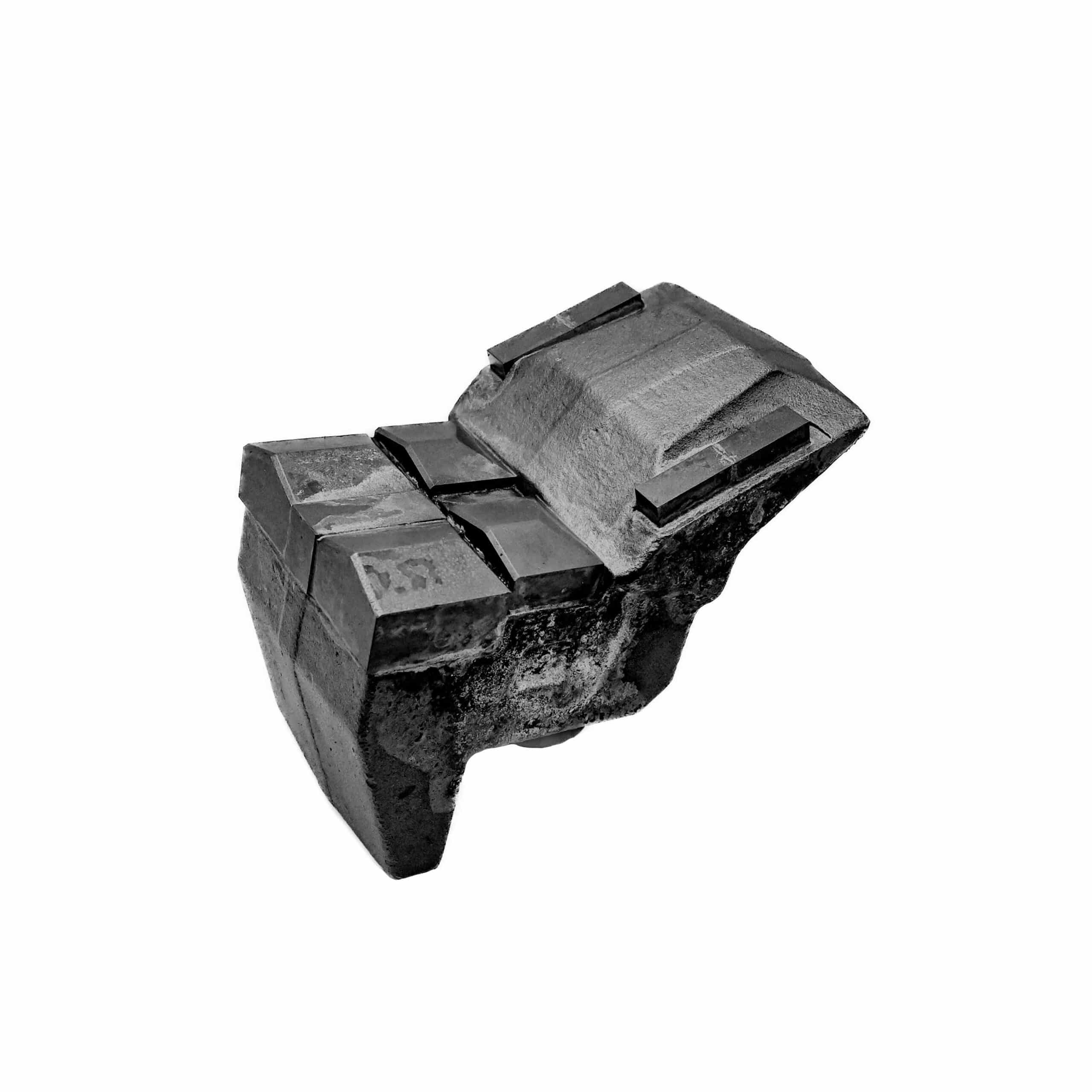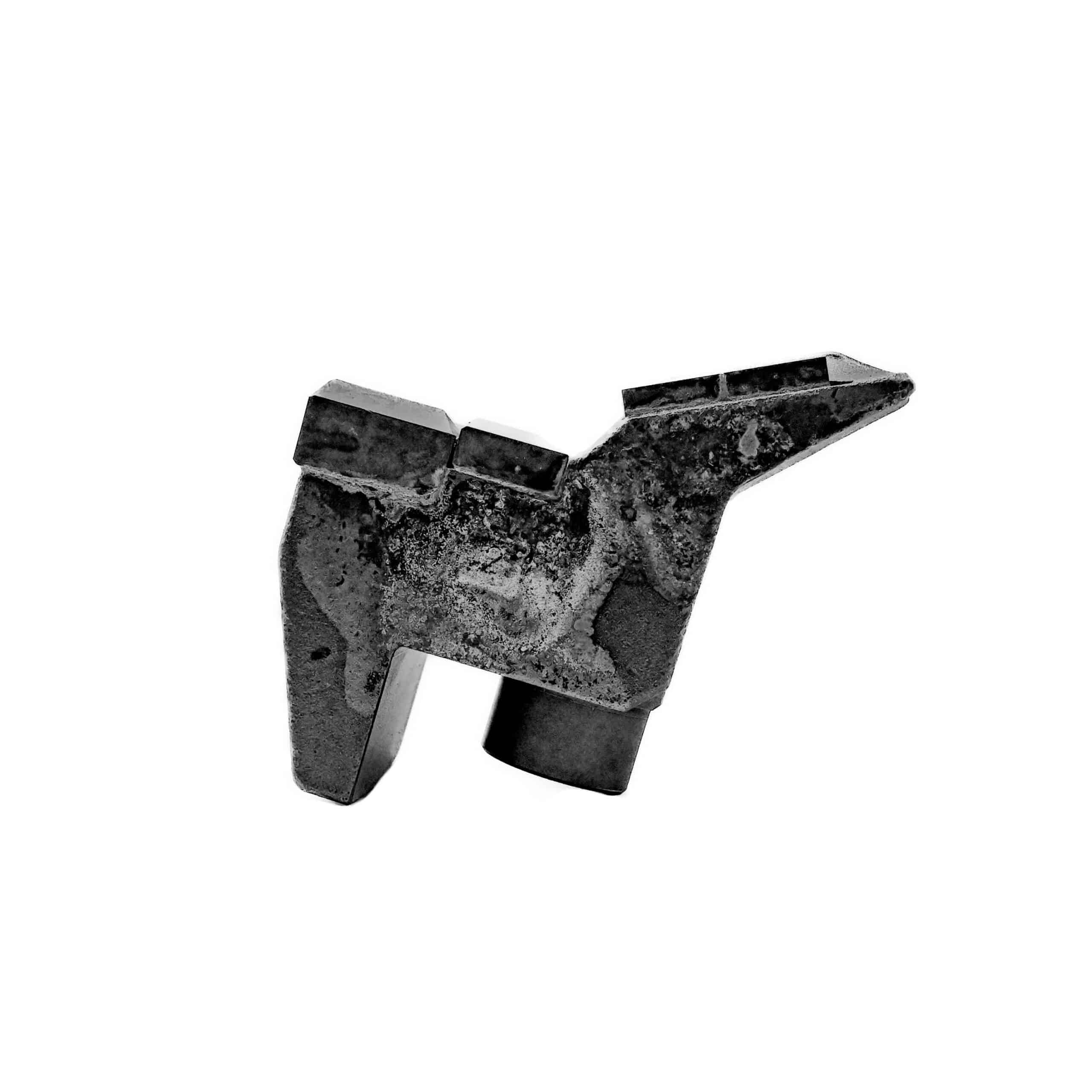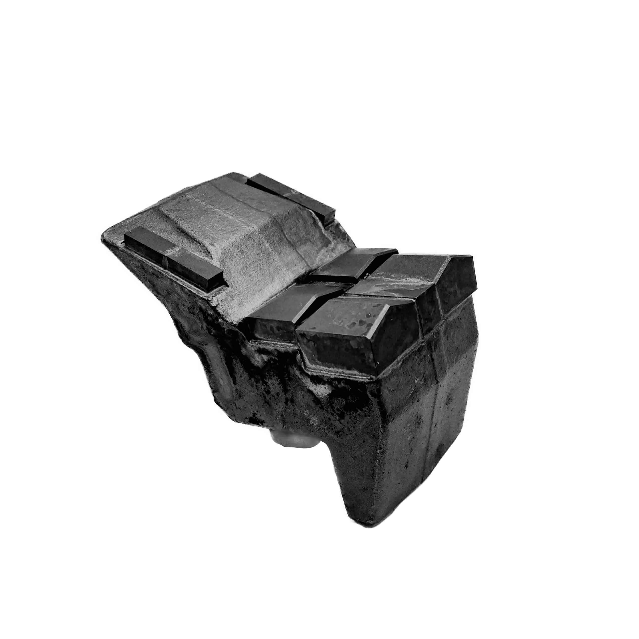 Aftermarket replacement quad carbide stone crushing hammer with extra carbide in high wear areas. The extension leg will overlap the holder. Carbide wear protection on extension.